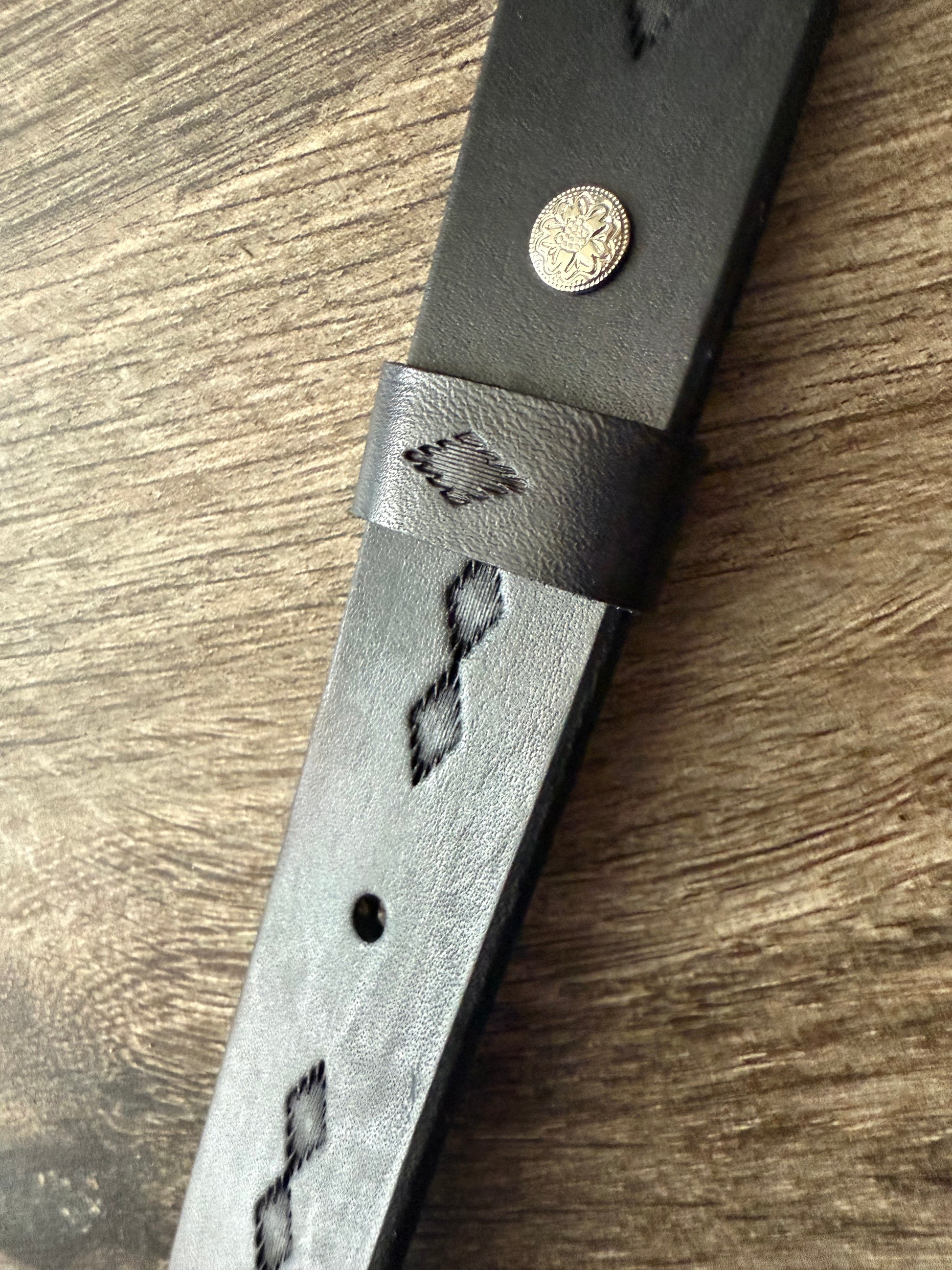 Gorgeous hand-tooled southwestern pattern finished in antique black. Features a premium Horse Shoe brand western floral concho and floral Chicago screw for length adjustment. Made from full-grain 8-9 oz veg-tanned leather. 1.25-inch width, adjustable length (33- to 43-inch). Option to include swivels.