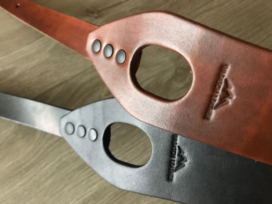 Includes your choice of stamp, the Wasatch Leather maker’s mark, black rivets, and black Chicago screws for length adjustment. Available in brown or black. Adjustable length (33- to 42-inch). GrovTec swivels available as an option in black or nickel.