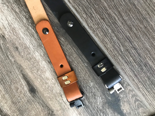 Cobra-style rifle sling – we call this one the “Venom” sling – offered in tan or black, with your choice of personalization and stamp. 2.25-inch at the widest point tapering to 1-inch at both ends. Features beautifully hand-burnished edges, a hand-polished protective finish, the Wasatch Leather maker’s mark and gun metal Chicago screws for length adjustment. Made from premium full-grain 8-9 oz veg-tanned leather. Adjustable length (35- to 45-inch). GrovTec swivels available as an option in black or nickel